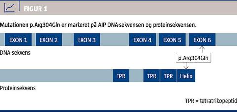 AIP-genet er lokaliseret i nærheden af MEN1-genet på kromosomregionen 11q13. AIP-genet indeholder seks exoner, der koder for et 330 aminosyrer stort protein (Figur 1)[14]. Der er på nuværende tidspunkt beskrevet 60 forskellige mutationer i AIP-genet, heriblandt deletions-, insertions-, nonsense-, missense-, splice-site- og promotermutationer samt segmental duplikation [9, 15].