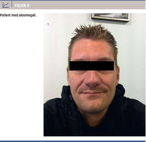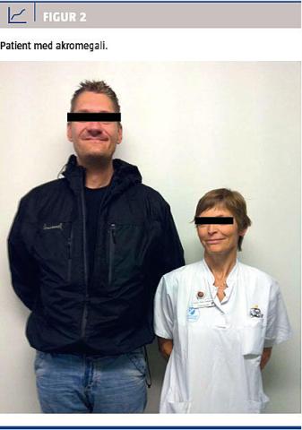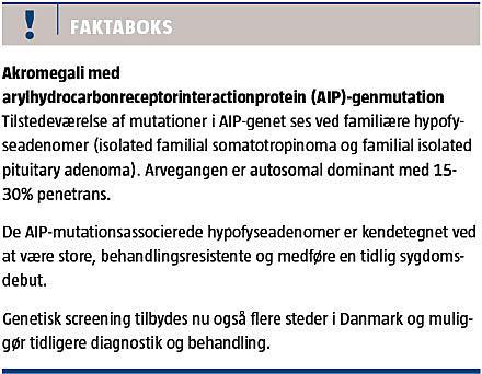Genetisk udredning for AIP-genmutation udføres på Aarhus Universitetshospital, Odense Universitetshospital og Rigshospitalet. Den første familie i Danmark med AIP-mutation er for nylig identificeret. Mistanke opstod i forbindelse med udredningen af en 37-årig mand, som var henvist til endokrinologisk afdeling på mistanke om akromegali. Patienten havde karakteristiske akromegale træk med tegn på tidlig sygdomsdebut før epifyseskivelukning, hvilket havde resulteret i, at hans højde var 2,08 m (Figur 2, Figur 3). Diagnosen blev biokemisk verificeret med måling af forhøjet GH og IGF-I i serum, og resultaterne af en MR-skanning af hypofysen var forenelige med tidligere apopleksi i et hypofyseadenom. Patientens faster blev diagnosticeret med og behandlet for akromegali i 37-årsalderen.