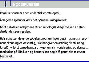 IS er symptomet på en underliggende epileptisk encefalopati. Incidensen for IS er 1:2.000 børn, svarende til 20-30 nye tilfælde pr. år i Danmark [4-6]. Anfaldssemiologien (epileptiske spasmer (ES)) er en pludselig fleksion og/eller ekstension, primært i de proksimale eller trunkale muskler, evt. asymmetrisk. ES kommer typisk i serier, men kan forekomme enkeltvis. Kun ca. to tredjedele af patienterne har klassisk Westsyndrom med triaden: ES, hypsarytmi ved elektroencefalografi og tab/stagnation i psykomotorisk udvikling [7, 8]. I omkring 60% af IS-tilfældene kan man fastlægge en ætiologi [9]: tuberøs sklerose (TS) 7%, cerebrale malformationer 8%, kromosomfejl 8%, cerebralt infarkt 8%, hypoksisk-iskæmisk encefalopati 10%, periventrikulær leukomalaci/hæmoragi 5% og andre kendte årsager 15%. Ætiologien er vigtig af hensyn til behandling af og prognose for patienterne, som spænder fra de 10-20%, der ikke får kognitive senfølger, til den store gruppe, der får svær mental retardering [1, 5, 10, 11]. Blandt børn med uforklarede IS kan man med intensiveret diagnostik, specielt genetisk testning, herunder array -baseret komparativ genomisk hybridisering (CGH), afklare en væsentlig andel [2, 3, 12]. I artiklen omtales genetiske tilstande, som kan overvejes, hvis et udredningsprogram, der er tilpasset de kliniske fund, ikke har givet en specifik diagnose.