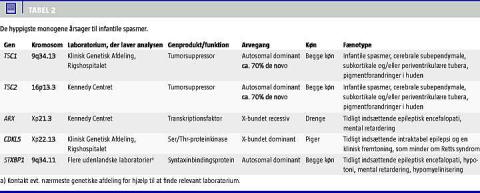 Epilepsi forekommer hos 5-10% af personerne med Downs syndrom, og i ca. halvdelen af tilfældene er der tale om IS som første anfaldstype [15]. Tidlig debuterende epilepsi er et kendetegn for 1p36-deletions-syndrom, hvor der hos omkring 60% af patienterne vil udvikles epilepsi med IS som den hyppigste anfaldstype [16]. Patienter med 15q-inversions-duplikations-syndrom har ligeledes en overhyppighed af epileptiske anfald og IS [17]. Williams syndrom (WS) er et contiguous gene -syndrom, mikrodeletionssyndrom på kromosom 7. De færreste med WS har IS, men når de har det, vil hele sygdomsbilledet fremstå sværere. Her vil der ofte være tale om deletioner, som strækker sig længere distalt på kromosom 7, og som medinddrager genet MAGI2 . I et studie har man påvist, at 15 ud af 16 personer med WS og IS/epilepsi havde en deletion, der inkluderede MAGI2 [18] (Tabel 1 ). Supplerende array -CGH-undersøgelse vil her være indiceret. Også ved andre mindre velbeskrevne kromosomforandringer ses der IS, og array -CGH vil være et rimeligt førstevalg, hvis ikke den generelle udredning peger på et specifikt syndrom.