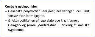 De genetiske polymorfier i GST-generne ændre aktiviteten på forskellig vis. Baggrunden for de genetiske polymorfier i både GSTM1 og GSTT1 er deletioner, hvilket betyder, at enzymerne ikke produceres, og at man derfor har et nedsat forsvar over for nogle miljøgifte, f.eks. tjærestoffer. Ca. 50% af den danske befolkning udtrykker ikke GSTM1-genet, mens ca. 15% ikke udtrykker GSTT1-genet [4]. Personer, der ikke udtrykker et enkelt eller begge gener, har en lidt øget risiko for at få ca. 20 forskellige kræftformer. Den relative risiko for at få lungekræft blandt rygere var 1,17 for personer, der ikke udtrykte GSTM1-genet i forhold til personer, der udtrykte genet [5]. Den risiko, der er relateret til disse polymorfier, er ikke særlig stor, men da frekvensen i befolkningen er høj, har de fra et folkesundhedssynspunkt en stor betydning. Det er estimeret, at manglen på GSTM1-genet blandt rygere kan forklare ca. 20% af de observerede kræfttilfælde. Denne effekt er især udtalt ved lave eksponeringer, og det er estimeret, at deletionen af GSTM1 kan forklare 60% af de lungekræfttilfælde, der ses blandt personer, der er udsat for passiv rygning [6]. I flere studier er det vist, at personer, der ikke udtrykker GSTT1 og GSTM1, har en øget risiko for at få lungekræft især blandt rygere med begrænset tobaksforbrug, mens fravær af GSTT1 tilsyneladende er en beskyttende faktor hos storrygere [7]. I en undersøgelse udført i den danske kost-kræft-kohorte fandt vi, at hos rygere var deletion af GSTT1 en risikofaktor, og at den relative risiko var størst hos yngre patienter og hos patienter med planocellulært karcinom [8].