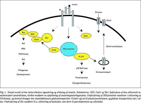 Insulin initierer sin virkning ved at binde sig til insulinreceptoren, der er placeret i plasmamembranen og består af en ekstracellulær, transmembran og intracellulær del (Fig. 1). Binding af insulin medfører aktivering af insulinreceptor-tyrosinkinasen og efterfølgende fosforylering af adskillige endogene substrater. Det første substrat blev påvist i 1992 og betegnet IRS-1 (insulin receptor substrate-1). Siden er der påvist en hel familie af insulinreceptor substrater (IRS-1-4, Gab1, Shc m.m.) (Fig. 1) (6).
