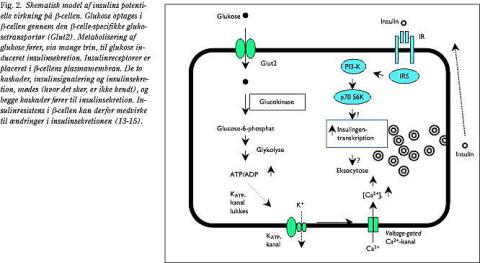 Patogenesen for type 2 (ikke-insulinkrævende)-diabetes mellitus er kompleks og involverer abnormiteter både i virkningen af insulin i insulinfølsomme væv (insulinresistens) og i insulinsekretionen fra pancreas' b-celler (nedsat og forsinket insulinsekretion). Hvilken af de to biokemiske defekter der optræder primært og sekundært i den prædiabetiske tilstand, er stadig et emne for debat (1). Det er dog generelt accepteret, at både nedsat insulinstimuleret glukoseoptagelse (dvs. insulinresistens) samt nedsat pankreatisk b-cellerespons skal være til stede, for at manifest diabetes udvikles (1).