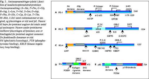 IRS-4. Genet for human IRS-4 indeholder, ligesom IRS-1 og -2, adskillige aminosyrevarianter (Fig. 3C) (31). Ingen af varianterne er i sig selv associeret med type 2-diabetes eller intermediære fænotyper af diabetes. Det er dog interessant, at genet der koder for IRS-4, er placeret på X-kromosomet. En opsplitning i køn af den undersøgte population viste ingen forskelle mellem bærere og ikke-bærere inden for hvert køn (31).