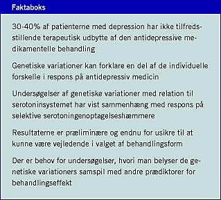 Serotonintransporteren (5-HTT) er angrebspunkt for lægemidler med serotoningenoptagelseshæmmende virkning. Genet for serotonintransporteren indeholder en polymorfi i promotorregionen, 5-HTT-linked polymorphic region (5-HTTLPR). 5-HTTLPR er forbundet med forskelle i genekspression: Den lange variant (l) medfører større transkriptionel aktivitet og basal aktivitet af transporteren end den korte allel (s). Smeraldi et al [1] rapporterede i 1998 første gang om en association mellem 5-HTTLPR og respons på antidepressiv medicin. Patienter, som havde den lange allel (l-l eller l-s), responderede bedre på fluvoxamin end patienter med to korte alleller (s-s). I flere andre undersøgelser har man siden genfundet lignende observationer, nemlig hurtigere eller bedre effekt af SSRI hos bærere af den lange allel [2, 3]. Den prædiktive værdi af de genetiske variationer er dog beskeden; det er anslået, at 5-HTTLPR er årsag til omkring 7% af variansen i responsrate [4].