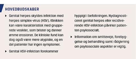 Den selvrapporterede prævalens af genital herpes blandt danske kvinder i alderen 18-45 år er 5,6% [4]. Den estimerede prævalens på verdensplan er 11,3% [5]. En betragtelig del af personerne med HSV-infek-tion er uden symptomer, og i et mindre, dansk studie blev der målt HSV-2-antistoffer hos 26% af kvinderne og 15% af mændene uden kendt genital herpes [6].
