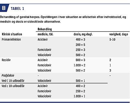 Profylaktisk antiviral behandling nedsætter antallet af recidiver og er indiceret ved hyppige og smertefulde udbrud af genital herpes. På trods af forebyggende behandling vil patienten af og til opleve recidiver. Der er ikke observeret toksicitet eller organpåvirkning ved langtidsbehandling. Dosisreduktion er kun påkrævet ved svært nedsat nyrefunktion. Blodprøvekontrol er ikke nødvendig hos i øvrigt raske personer. Det anbefales at revurdere behovet for profylaktisk behandling mindst én gang årligt [8]. Anbefalet forebyggende behandling fremgår af Tabel 1.