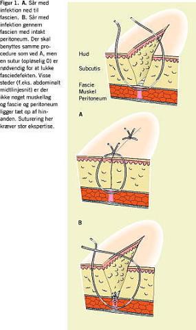 Hos ikkeadipøse patienter kan såret sutureres eventuelt i lokal anæstesi, men i de fleste tilfælde vil det være nødvendigt med en universel anæstesi. Der gives antibiotika umiddelbart før anæstesien indledes (cefuroxin 1,5 g i.v. som engangsdosis). Sårkanterne undersøges og evt. nekroser fjernes. Såret lukkes med en monofilsutur i en så stor nål, at den kan komme helt rundt om sårkaviteten. Figur 1 viser, hvorledes sutureringsproceduren foretages, også ved eventuelle fasciedefekter.
