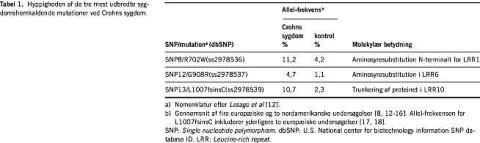Allel-frekvensen af de tre vigtigste sygdomsfremkaldende mutationer ligger omkring 5-11% hos Crohn-patienter, mens frekvensen for kontrolgruppen og colitis ulcerosa-patienter ligger omkring 1-4% (Tabel 1). Der er ingen forskel på allel-frekvensen hos patienter med sporadisk og familiært forekommende morbus Crohn [14].