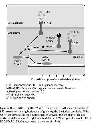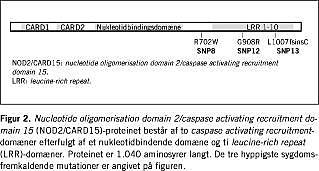 Crohns sygdom og colitis ulcerosa er kroniske inflammatoriske tarmsygdomme, som formodes at opstå som følge af en vedvarende aktivering af det lokale T-lymfocyt-respons udløst af tarmens normale flora [1, 2] eller af en endnu ikke identificeret mikroorganisme [3]. Den nøjagtige mekanisme er ukendt, men involverer formentlig en defekt i den eller de signalveje, der regulerer samspillet mellem tarmfloraen og det lokale immunapparat [1]. Det er i dag veldokumenteret, at genetiske faktorer også er af betydning for udvikling af inflammatorisk tarmsygdom [1]. Klarest er det vist i tvillingestudier, hvor sygdomskonkordansen blandt monozygote tvillinger med Crohns sygdom er ca. 50%, mens den ved colitis ulcerosa er væsentlig lavere (ca. 19%) [4]. Specielt ved Crohns sygdom har man derfor søgt intenst efter gener, som er koblet til sygdommen, og en række nyere molekylærgenetiske studier har bidraget med afgørende viden herom. I denne artikel gennemgår vi den funktionelle og kliniske betydning af de vigtigste mutationer i nucleotide oligomerisation domain 2/caspase activating recruitment domain 15 (NOD2/CARD15) ved Crohns sygdom.
