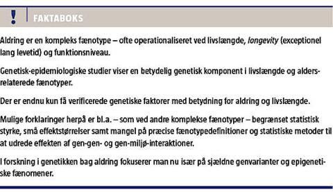 I genetisk-epidemiologiske studier har man påvist en væsentlig genetisk indflydelse på mange aldringsfænomener, inklusive livslængde. Chancen for at opnå en høj levealder er f.eks. markant større for slægtninge til »længelevere« [3]. I tvillingestudier har man estimeret, at ca. 25% af variationen i livslængde kan tilskrives genetiske faktorer [4], mens resultaterne af flere studier tyder på, at det exceptionelt lange liv har en endnu højere heritabilitet [5, 6]. Genetiske faktorer spiller desuden en afgørende rolle for en række aldersrelaterede fænotyper, som f.eks. fysisk og kognitiv funktion, der blandt ældre har en heritabilitet på mere end 50% [7, 8].