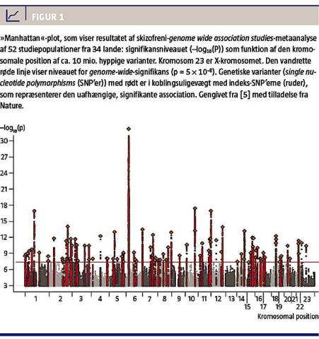 De tre første signifikante GWAS-fund blev publiceret i 2009 [2, 3] og er for nylig kulmineret med identifikationen af 108 uafhængige loci (kromosomområder), som indeholder risikovarianter for skizofreni [5] (Figur 1).
