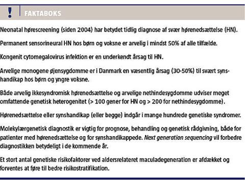 Arvelige synshandikap omfatter især arvelige retinale dystrofier, arvelig opticusatrofi, kongenit katarakt og kongenit glaukom. De udgør den væsentligste årsag til synshandikap hos børn og yngre voksne. Der er stor genetisk heterogenitet, dvs. at mutationer i mange forskellige gener kan føre til samme fænotype. Det gælder især for arvelige nethindesygdomme med over 200 forskellige gener [11]. Dette har hidtil vanskeliggjort klinisk brugbar mutationsdiagnostik. NGS-teknologi med samtidig undersøgelse af et stort antal gener i genpaneler er nu etableret til klinisk molekylærgenetisk diagnostik, samtidig med at mere forfinet oftalmologisk diagnostik indgår i karakteristikken af de mange subtyper. I et nyligt publiceret arbejde påviste man patogen mutation hos ca. halvdelen af en gruppe patienter med forskellige former for RP ved at undersøge et genpanel med over 100 retinagener [12]. Ved sekventering af hele exomet kan yderligere nyerkendte gener påvises [13].