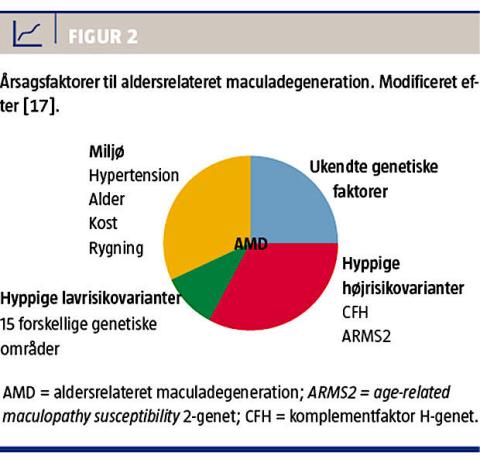 komplementsystemet er den væsentligste faktor i udviklingen af AMD. I yderligere studier har man identificeret en række andre genetiske risikovarianter [17]. Varianter i de to områder på kromosom 1q31 og 10q26 udgør det største genetiske bidrag til AMD, men kan ikke for øjeblikket bruges til forudsigelse af sværhedsgrad eller progression. Der er udført adskillige studier med henblik på om muligt at identificere farmakogenetiske faktorer med betydning for bl.a. respons på anti-vascular endothelial growth factor-intraokulære injektioner, som er dagens state of the art-