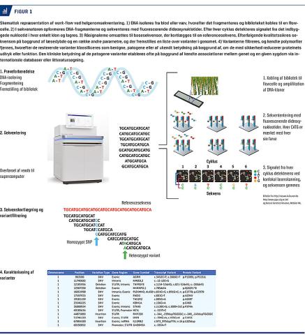 DNA-stykket (Figur 1). Hvis man har tilstrækkelig beregningskapacitet, kan den seneste generation af sekventeringsmaskiner kortlægge et helt genom, helgenomsekventering (WGS), på fire dage. I en årrække har man primært arbejdet med genpaneler og såkaldt exomsekventering, hvor man undersøger de kodende områder af genomet, men WGS er hurtigere, og med den metode finder man flere genvarianter i både det
