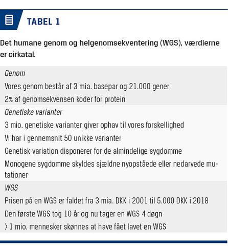 I relation til WGS er beregningskapaciteten lige nu en limiterende faktor, og i takt med at undersøgelserne bliver mere almindelige, er den planlagte udvidelse af de danske supercomputere kærkommen. Der findes et utal af forskellige bioinformatiske værktøjer til håndtering af de store datamængder. Fælles for dem alle er, at analyserne som udgangspunkt falder i tre dele [11] (Figur 1): 1) kortlægning (mapping) af de rå sekvenssignaler mod en referencesekvens, 2) filtrering af varianter og 3) filtrering og identifikation af patogene varianter i relation til en given sygdom eller symptomer. En WGS omfatter tre milliarder nukleotider, og man ender med ca. tre millioner varianter (Tabel 1), hvoraf 20.000 er lokaliseret i de kodende områder af generne. Ved en monogen sygdom leder man efter én sygdomsfremkaldende variant, og ofte vil man starte med at fokusere på varianter i kendte sygdomsgener. Finder man ikke noget, som kan forklare patientens symptomer, kan man gå videre med at undersøge varianter inden for samme biologiske signalveje eller proteinkomplekser i håb om at lokalisere en formodet patogen variant. Denne skal i givet fald karakteriseres yderligere, eventuelt med funktionelle undersøgelser i relation til