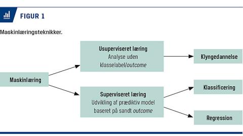Ved superviseret analyse derimod har vi ud over de mange datapunkter information om »sandt« outcome, og øvelsen går ud på ud fra de mange datapunkter at finde en model, som kan forudsige outcome. Hvis det er kategoriseret som syg/rask, er der tale om klassificering, men hvis det er kontinuert, er der tale om regression (Figur 1 og Figur 2). Det er her vigtigt at være opmærksom på, at hvis antallet af datapunkter er meget større end antallet af individer, hvilket ofte er tilfældet, betyder det store antal frihedsgrader, at det næsten altid vil være muligt at bygge en model, der passer nogenlunde med outcome. Det er imidlertid ikke sikkert, at den efterfølgende passer på en uafhængig kohorte af individer. Det er derfor nødvendigt at dele materialet op i et træningssæt og et testsæt for derefter at træne eller oplære sin model i træningssættet og teste i testsættet (Figur 2). De algoritmer, som man bruger ved denne form for maskinlæring, kan være baseret på logistisk regression, support vector machines, neurale netværk, random forest eller lignende.