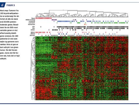 Som en slags proof of concept-eksempel på usuperviseret mønstergenkendelse er resultatet af en genekspressionsanalyse vist i Figur 3 [3]. Er det så muligt at finde mønstre i denne datamængde og finde grupper af tumorer, der ligner hinanden? AI-analysen fandt en gruppe på 32 tumorer (til venstre i figuren), som efterfølgende viste sig overvejende at have mutation i BRCA1, og (lidt til højre i figuren) en gruppe på 11 tumorer, som næsten alle viste sig at være HER2-positive. Af de resterende 140 tumorer blev 137 bestemt til at være østrogenreceptorpositive (ER+). I et meget tidligt arbejde fra 2001 sås blandt ER+-tumorer luminale subtyper, og der blev påvist forskelligt klinisk outcome i de to grupper [4]. Adskillelsen mellem luminal A- og luminal B-grupperne er senere forfinet baseret på analyse af ekspressionen af 50 udvalgte gener (PAM50-profilen), som i dag for undergrupper af patienter med brystkræft kan anvendes ved behandlingsvalg. Mønstre af genekspression i primærtumorer er således i stand til at finde biologisk og klinisk relevante undergrupper af patienter.