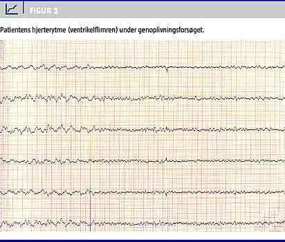 På lokalsygehuset pågik genoplivningen i mere end 45 minutter, hvor patienten hovedsageligt havde stødbar hjerterytme. Hjertestopholdet drøftede, om man skulle indstille behandlingen pga. det langvarige forløb, men umiddelbart herefter skiftede patienten fra lavamplitude-VF til højamplitude-VT. Patienten blev stødt til hjerterytme med palpabel puls, og blodtrykket var 82/64 mmHg. Herefter fik han igen VF (Figur 1 ), men blev stødt til sinusrytme. Han var bevidstløs efter opnåelse af spontant kredsløb. Under genoplivningsforsøget blev der indgivet adrenalin, amiodaron og magnesium intravenøst.
