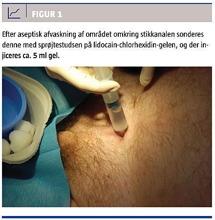 Den eksisterende stikkanal identificeres, og der afvaskes sterilt. Med sprøjtestudsen på lidocaingelen sonderes stikkanalen (Figur 1), og der indgives rigeligt lidocaingel i den. Hvis gelen problemfrit kan injiceres i kanalen, forsøges et almindeligt Foleysilikonekateter indført straks.