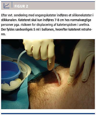 Er blæren udspilet og smertende, kan noget af urinen udtømmes på dette tidspunkt, men undlad så vidt muligt at tømme blæren helt, da genanlæggelse som nævnt er nemmest på en moderat fyldt blære. Afklem og lad engangskateteret sidde 3-4 minutter. Gentag proceduren med et engangskateter i næste størrelse, indtil stikkanalen er dilateret op til den ønskede størrelse eller størrelsen over. Herefter kan et silikonekateter med integreret ballon eller et almindeligt silikonekateter af samme størrelse eller en størrelse mindre end sidst anvendte engangskateter indføres (Figur 2).