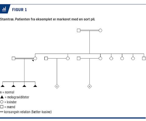 Hos en 38-årig kvinde udvikledes der fire gange molagraviditet. De tre blev histopatologisk beskrevet som komplette, og den sidste blev beskrevet som partiel. Patienten havde forsøgt insemination tre gange og in vitro-fertilisering tre gange uden opnåelse af yderligere graviditet. Der var så vidt vides ingen slægtninge med molagraviditeter. Patienten havde seks søskende: Tre søstre, der endnu ikke havde været gravide, to søstre, som havde normale graviditeter bag sig, og en bror, der endnu ikke havde fået børn (Figur 1). Forældrene var beslægtede, og patienten var selv gift med sin fætter. Efter den seneste evacuatio blev der sendt væv til histopatologisk og genetisk undersøgelse. Den genetiske undersøgelse viste, at der var tale om en diploid graviditet med et biparentalt genom. En blodprøve fra patienten blev sendt til analyse af generne NLRP7 og KHDC3L, som er relaterede til gentagne molagraviditeter. Man fandt homozygoti for en variant i NLRP7, hvilket kunne være en sandsynlig årsag til patientens gentagne mola. Patienten havde således med stor sandsynlighed en arvelig disposition for molagraviditet, hvilket er en yderst sjælden tilstand.
