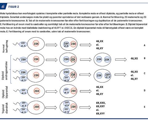Ved genetisk analyse af mola undersøges der for maternelt (M) og paternelt (P) genom. Et normalt conceptus indeholder et nukleært genomsæt fra moderen og et fra faderen. De fleste komplette mola er diploide, hvor begge nukleære genomsæt stammer fra faderen (diploid androgenese, PP) [8]. I ca. 80% af de diploide androgenetiske mola er genomet universel homozygot (P1P1), hvilket er foreneligt med, at det paternelle genom stammer fra én sædcelle, mens genomet i ca. 20% af de diploide androgenetiske mola udviser heterozyoti i en del loci, hvilket er foreneligt med, at genomet stammer fra to spermatozoer (P1P2). I diploide androgenetiske mola stammer mitokondriegenomet fra moderen, hvilket viser, at der har indgået en oocyt i zygoten [9]. De fleste partielle mola er triploide, hvor det ekstra genomsæt stammer fra faderen. I en triploid mola er der altid heterozygoti for paternelle markører (P1P2M) [10, 11] (Figur 2).