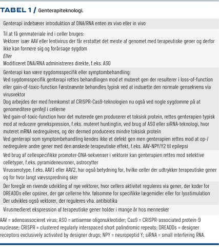 I 1990’erne var der stor optimisme vedr. genterapi som fremtidens behandling, men teenageren Jesse Gelsingers død i 1999 pga. immunreaktion mod adenovirus, der var anvendt til behandling af en sjælden sygdom, stoppede feltet i en årrække. Imidlertid har udvikling af sikre rekombinante virustyper (f.eks. adenoassocierede virus (AAV)) genoplivet troen på genterapien i den seneste dekade [1, 2], hvor en rivende udvikling er startet med dannelse af mange nye biotekfirmaer, ligesom store medicinalfirmaer har fået øjnene op for feltet. I denne artikel vil vi fokusere på sygdomme i centralnervesystemet (CNS), hvor genterapi for nylig har fået vind i sejlene efter godkendelse af voretigene neparvovec i USA og EU til behandling af retinitis pigmentosa og onasemnogene abeparvovec til behandling af spinal muskulær atrofi i USA [1-5].