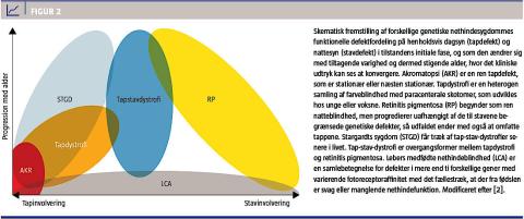 De arvelige retinale dystrofier som akromatopsi, retinitis pigmentosa, tap-stav-dystrofi m.m. skyldes defekt fotoreceptorfunktion, som forårsages af mutationer i gener med betydning for tappene, stavene eller pigmentepitelcellerne. Adskillelsen mellem de forskellige typer kan være meget subtil, ja endog arbitrær, og forskellige mutationer i det samme gen kan medføre forskellige kliniske diagnoser. Der er således en meget stor genetisk og klinisk/fænotypisk overlapning [2] (Figur 2). En oversigt over alle gener, der er involveret i retinale sygdomme, kan ses i [10].