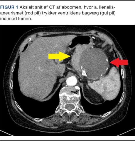 A. lienalis-anurismer er sjældne, men kan være fatale, idet de kan rumpere og resultere i cirkulatorisk shock og død. Prævalensen er estimeret til omkring 0,8% [1]. De fleste er asymptomatiske, men kan præsentere sig med smerter i epigastriet eller øvre venstre kvadrant. De er overvejende små (< 2 cm) [1], men kan blive større end 10 cm [2]. Risikofaktorer er hunkøn (4:1) [1], traume, arteriel hypertension, aterosklerose, multiparitet og portal hypertension [2]. Diagnosen stilles oftest tilfældigt ved CT af abdomen foretaget på anden indikation. Vi præsenterer her en case, hvor mistanken til et a. lienalis-aneurisme opstod ved en gastroskopi.