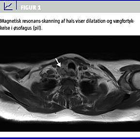 Billeddiagnostik (magnetisk resonans-skanning og computertomografi) viste en ca. 1,5 × 4 cm stor uregelmæssig dilatation af øsofagus og vægfortykkelse 4 cm efter afgangen. I jugulum sås en 16 mm stor cystisk forandring ved den palpable knude fortil på halsen og forstørrede lymfeknuder i mediastinum (Figur 1 ).