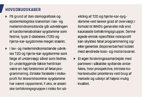 I LMIL – især i Asien – udvikler kroniske sygdomme som T2D og hjerte-kar-sygdomme sig ofte hurtigt og tidligt [8]. Hurtigt skiftende levekår og livsstil kan betyde, at et barn som foster udsættes for underernæring og infektioner og fødes undervægtigt. Som voksen havner det måske på en fabrik, lever af mad bestående af simple kulhydrater samt mættede fedtsyrer og har ringe muligheder for motion. Det undervægtige barn er blevet programmeret til sult (thrifty phenotypic [9]) og født »tynd-fed« med 20% fedtmasse mod normalt 10% [10]. Følgelig kan T2D og hypertension også udvikles uden overvægt, rygning og alkohol. Føtal programmering er også påvist hos danske børn med lav fødselsvægt [11]. Undervægt øger risikoen for T2D lige så meget som overvægt (Figur 1) [12], selvom den ætiolo-