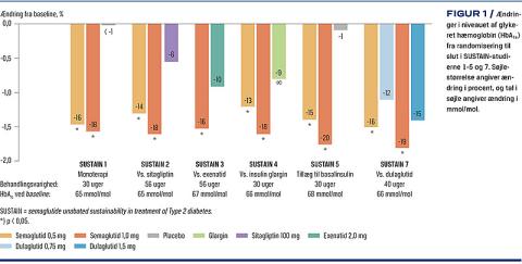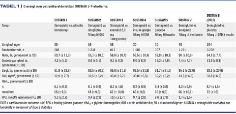 I fase 3-udviklingsprogrammet SUSTAIN 1-7 er der inkluderet 8.416 patienter [8-14]. SUSTAIN 6-studiet er et kardiovaskulært endepunktsstudie [13]. Varigheden af studierne er 30-52 uger, bortset fra SUSTAIN 6-studiet, hvor den gennemsnitlige opfølgningstid var 104 uger. Semaglutid er sammenlignet med placebo i monoterapi, som tillæg til metformin, til to antidiabetika eller til insulinbehandling og er blevet sammenlignet med sitagliptin, exenatid (én gang om ugen), dulaglutid (én gang om ugen) og insulin glargin [8-12, 14].
