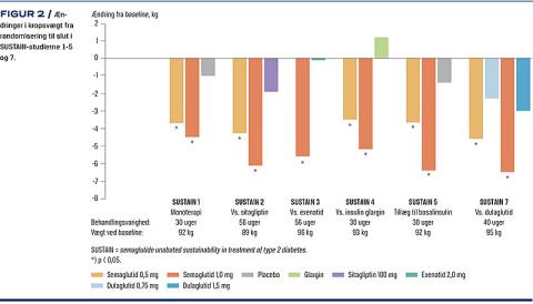 Vægttabet med semaglutid 0,5 mg var i SUSTAIN-studierne 3,5-4,6 kg og med 1,0 mg 4,5-6,5 kg (Figur 2) [8-12, 14]. For begge doser var vægttabet signifikant større end ved behandling med placebo og ved GLP-1-