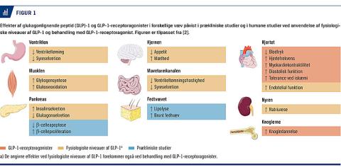 Inkretinhormonerne GLP-1 og gastric inhibitory peptide (GIP) frigives fra tarmen i forbindelse med fødeindtag. Inkretinhormonerne medierer inkretineffekten, som er defineret ved den større insulinsekretion efter et peroralt glukoseindtag end efter en intravenøs glukoseinfusion, hvor der opnås identiske plasmaglukoseværdier. Hos den raske person sørger inkretineffekten for op til 70% af insulinsekretionen efter et peroralt indtag af glukose og udgør således en central del af den postprandiale regulering af blodsukkeret [4]. I modsætning til ved GIP er den glukosesænkende effekt af GLP-1 bevaret om end reduceret hos personer med type 2-diabetes, hvilket er baggrunden for GLP-1-baseret behandling af type 2-diabetes [5]. I den pankreatiske betacelle resulterer stimulation af GLP-1-receptoren i sekretion af insulin, dog kun når koncentrationen af glukose i plasma er over normalt fasteniveau. Ligeledes hæmmer GLP-1 frigivelsen af glukagon afhængigt af plasmakoncentrationen af glukose, hvilket formentlig medieres via parakrine effekter af somatostatin og insulin. GLP-1 hæmmer desuden ventrikeltømningen, hvilket forsinker optaget af næring fra tarmen, hvorved den postprandiale stigning i plasmaglukoseniveauet reduceres [2]. Yderligere er der observeret effekter af GLP-1 og GLP-1-receptoragonister i en lang række andre væv (Figur 1).