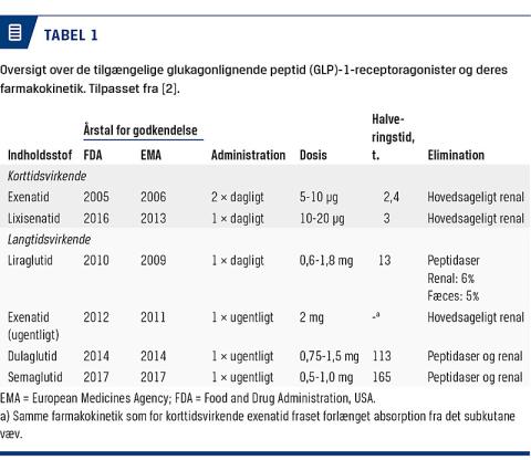 I Danmark behandles mere end 26.900 patienter med type 2-diabetes med glukagonlignende peptid 1 (GLP-1)-receptoragonister [1]. Den første GLP-1-receptoragonist blev godkendt til behandling af type 2-diabetes i 2005, og med godkendelsen af semaglutid i 2017 er yderligere seks præparater kommet til [2]. GLP-1-receptoragonister er i guidelines anbefalet som behandling efter metformin på lige fod med øvrige godkendte antidiabetika til patienter uden hjerte-kar-sygdom [3]. Ved klinisk hjertesygdom bør GLP-1-receptoragonister og sodium-glucose co-transporter 2 (SGLT-2)-hæmmere, som begge har vist effekt på patienter med type 2-diabtes og kardiovaskulær sygdom, derimod overvejes frem for øvrige antidiabetika som andetvalgsbehandling. Effekt og bivirkninger af de for nuværende tilgængelige GLP-1-receptoragonister varierer, hvorfor vi med denne artikel ønsker at give et overblik over de enkelte præparater i denne klasse.