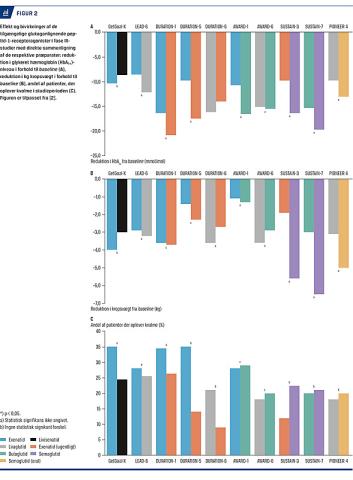 I Danmark findes der fem godkendte langtidsvirkende GLP-1-receptoragonister (Tabel 1), hvoraf kun fire forsat er tilgængelige, da produktionen af albiglutid er stoppet pga. begrænset anvendelse og minimal effekt på reduktion af kropsvægten [9]. Fælles for de tilgængelige GLP-1-receptoragonister er, at de medfører kontinuerlig aktivering af GLP-1-receptoren, da de er konstrueret således, at de enten frigives langsomt til det systemiske kredsløb efter administration eller har nedsat renal udskillelse som følge af proteinbinding [2]. Liraglutid har vist signifikant større reduktioner i HbA1c-niveauet end exenatid (ved ugentlig administration) [10], mens der ikke er fundet noget forskel i reduktion i HbA1c sammenlignet med dulaglutid [11]. Den seneste GLP-1-receptoragonist, semaglutid, har vist signifikant større reduktioner i HbA1c end både dulaglutid og exenatid (ved ugentlig administration) [12, 13], mens der ikke er gennemført studier, hvor man har sammenlignet effekten af semaglutid med liraglutid (Figur 2A). Behandling med liraglutid og semaglutid er desuden for begge påvist at have givet signikant større reduktioner i kropsvægt end behandling med dulaglutid og exenatid (ved ugentlig administration) (Figur 2B) [11-14].