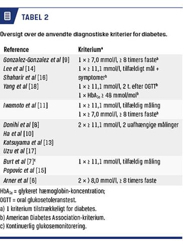 Vi har gennemgået 13 studier (Tabel 1 + Figur 1), hvor indikationen for højdosis-GK-behandling bl.a. var cancer [9, 12, 14], pneumoni [15], exacerbation af kronisk obstruktiv lungesygdom (KOL) [7] og systemisk lupus erythematosus (SLE) [10, 16]. Studierne er således heterogene, hvad angår patientkarakteristika, dosering og varighed af GK-behandling. Perioden med højdosis-GK-behandling er ofte kortvarig (dage) og udgør oftest kun en del af den samlede periode med GK-behandling. Glukosemonitoreringen varierer mht. metode fra analyser af glukoseniveau i døgnurin til oral glukosetoleranstest (OGTT) og mht. målefrekvens fra én måling på tre måneder [18] til kontinuerlig glukosemonitorering (CGM) [7] med målinger hvert femte minut. Endelig er der forskelle i de diagnostiske kriterier for diabetes. I fire af studierne anvendte man kriterierne fra den amerikanske diabetesforening (ADA), mens man i de ni andre anvendte andre kriterier (Tabel 2).