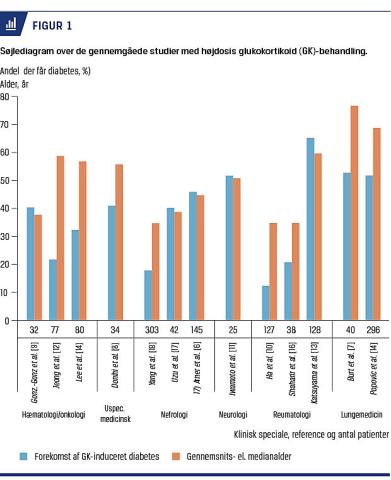 I fire studier fandt man en intermediær forekomst på 32,5-41,2%. Gonzalez-Gonzalez et al [9] og Lee et al [14] diagnosticerede efter ADA-kriterierne og fandt patienter med non-Hodgkins lymfom og akut lymfatisk leukæmi, som havde fået cyklisk højdosis-GK som en del af et kemoterapiregime. Lee et al [14] målte BG-niveau både fastende og postprandialt, men det er ikke oplyst, om det skete før eller under den cykliske GK-behandling. Gonzalez-Gonzalez et al [9] og Uzu [17] ekskluderede patienter, hvis faste-BG-niveau var ≥ 5,6 mmol/l før GK-behandling. Gonzalez-Gonzalez et al [9] målte BG-niveauet postprandialt tre gange om ugen, mens Uzu et al [17] målte glukose i døgnurin to gange ugentligt. Donihi et al [8] beskrev medicinsk indlagte patienter, der havde fået højdosis-GK-behandling i ≥ 2 døgn.