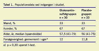 Materiale og metoder: En tremåneders postmarketing, randomiseret, dobbeltblindet, placebokontrolleret klinisk undersøgelse blev udført med parallelle grupper af forsøgspersoner ældre end 40 år med ledsmerter gennem længere tid. Seksogtres patienter modtog enten glukosaminsulfat i anbefalet dagsdosis (1.500 mg) eller placebo. De primære effektparametre var fasteplasmaniveauer af kolesterol (totalkolesterol, low density lipoprotein (LDL)-kolesterol og high density lipoprotein (HDL)-kolesterol) og triglycerider. De sekundære effektparametre var patienternes egenvurderede bivirkninger.