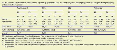 Resultater: Der var der ingen signifikant forskel mellem glukosaminsulfat- og placebogruppen i forhold til kolesterol og triglycerider. Der var ingen forskel mellem behandlingsgrupperne med hensyn til bivirkninger.