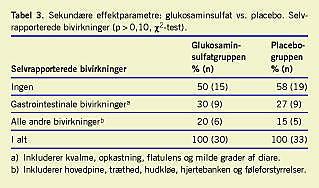Hverken vores eller den belgiske undersøgelse kan dog entydigt afvise muligheden af, at glukosaminsulfat forårsager signifikant stigning i kolesterol eller triglycerider hos et lille antal påvirkelige patienter. Afklaring af dette kræver studier med en større population og/eller længere opfølgningsperiode. Undersøgelsens resultater med hensyn til selvrapporterede bivirkninger stemmer godt overens med resultaterne af tidligere kliniske studier af glukosaminsulfat [1-3].