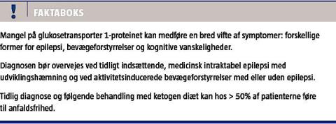 For nylig er mutationer i SLC2A1 blevet associeret med klassiske epilepsisyndromer som idiopatisk generaliseret epilepsi (ca. 1% af patienterne) [7], myoklon astatisk epilepsi (ca. 5% af patienterne) [8] og tidligt indsættende absenceepilepsi (EOAE) [9, 10]. I undersøgelser har man påvist, at 12% af patienterne med EOAE i form af klassisk absenceepilepsi med anfaldsdebut før det fjerde leveår, havde mutationer i SLC2A1 [10, 11].