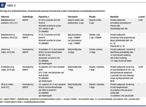 Der er fem publicerede, dobbeltblindede, randomiserede, placebokontrollerede studier (DBRPCT) af god kvalitet med voksne (Tabel 2) [21, 24-27] og kun et enkelt med børn (abstract) [28], hvor man har undersøgt, om elimination af eller provokation med gluten kan forbedre eller forværre symptomerne hos personer med mulig NCGS og dermed indirekte bekræfte denne diagnose [28].