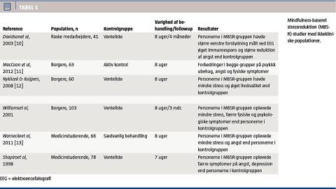 Tabel 1 (som kan ses på Ugeskriftet.dk i tilknytning til artiklen) viser resultaterne for seks studier med ikkekliniske populationer. Alle studier viser forbedring på en eller flere af følgende faktorer, der er relateret til mentalt helbred: angst, livskvalitet, depression og stress. Fysiske symptomer er målt i to studier, hvor man i begge målte en reduktion svarende til en forbedring af det fysiske helbred. I et enkelt studie målte man immunrespons og fandt en øget immunrespons efter interventionen. Kun i ét studie anvendtes en aktiv kontrolgruppe, og i dette studie reducerede begge interventioner psykisk ubehag, angst samt antal fysiske symptomer.