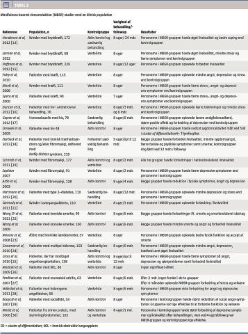 Tabel 2 (som kan ses på Ugeskriftet.dk i tilknytning til artiklen) viser resultaterne for 25 studier med kliniske populationer, hvoraf seks er med patienter med kræft, tre er med patienter med hiv, fire er med patienter med fibromyalgi, tre er med patienter med smerter, og to er med patienter med angstlidelser. De resterende syv er med blandede populationer, overvejende medicinske patienter. I 24 studier anvendte man mål på faktorer, som er relateret til mentalt helbred, såsom angst, depression, livskvalitet, stress og positiv affekt.