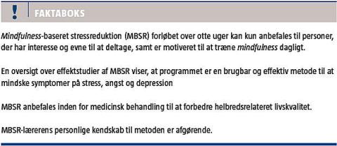 Den videnskabelige litteratur om mindfulness er nærmest eksponentielt stigende. Mindfulness-baserede interventioner er blevet populære som supplerende intervention ift. forskellige somatiske og psykiatriske lidelser [1, 2]. Denne statusartikel omhandler kun Mindfulness-baseret stressreduktion (MBSR), som er et kursus til håndtering af stress, smerte og kroniske sygdomme. Med udgangspunkt i MBSR har man udviklet programmet Mindfulness-Based Cognitive Therapy (MBCT), som inkorporerer elementer fra kognitiv terapi og er designet til undgåelse af tilbagefald (og ikke til behandling) af depression.