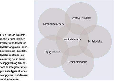 I Den Danske Kvalitetsmodel er der i standarderne formuleret krav til ledelsen i sundhedsvæsenet generelt. Der skal anvendes kvalitetsledelse med henblik på at udvikle og sikre kvaliteten af sundhedsvæsenets ydelser, herunder den sundhedsfaglige kvalitet i relation til forebyggelse, diagnostik, behandling, pleje, rehabilitering samt den organisatoriske kvalitet og den patientoplevede kvalitet [3].
