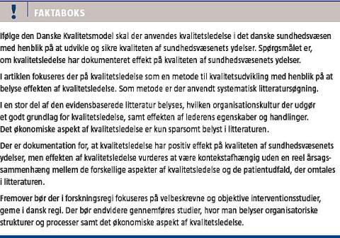 I denne artikel fokuseres der på kvalitetsledelse som en metode til kvalitetsudvikling i det danske sundhedsvæsen med henblik på at belyse evidensen for effekten af kvalitetsledelse på sundhedsvæsenets ydelser.