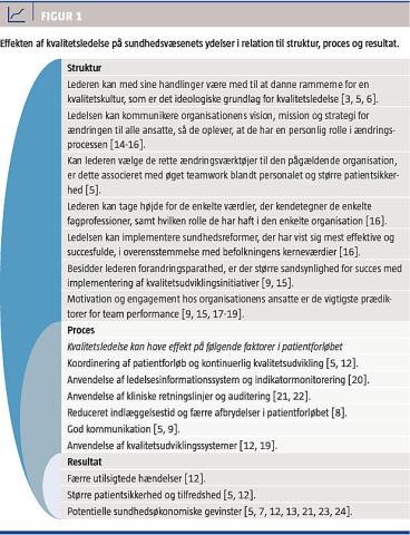 Kvalitetsledelse fokuserer på at sikre og udvikle kvaliteten af sundhedsvæsenets ydelser i relation til struktur, proces og resultat [3, 4] gennem dokumentation, monitorering og optimering af kvaliteten [3]. Det centrale spørgsmål er imidlertid, om kvalitetsledelse har effekt på kvaliteten af sundhedsvæsenets ydelser.